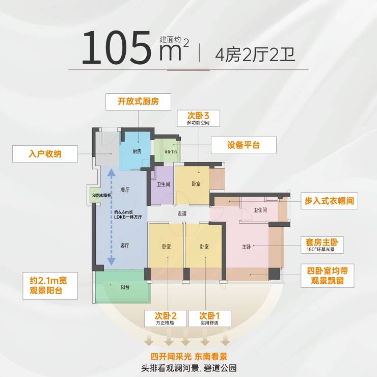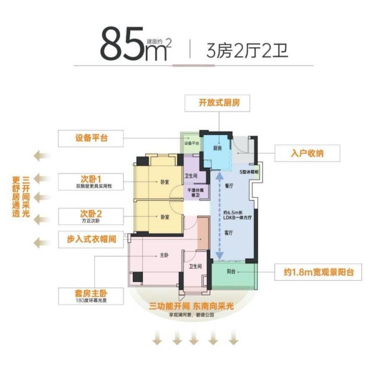 朝向景观亮点:1. 全部东南朝向,一线观澜河、碧道景观、观澜古墟景观2. 3个卧室开间西南或东南向,西南看园林、东南看观澜河碧道公园户型设计优点:1. 全明户型,视野开阔2. 主卧室180度环幕采光3. S型墙体设计冰箱位,空间利用更合理4. 干湿分离两空间公卫,兼并走廊空间更宽阔5. 客餐厅一体化设计,空间开阔,家人间互动交流感更强
