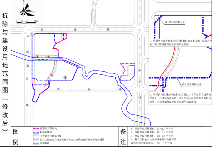 将新增核查国有未出让用地面积162.0㎡(现状为空地)调出原拆除范围及更新单元范围,调出用地功能按照原已批规划落实为道路用地;将原拆除范围内国有未出让用地12.5㎡(现状为空地)一并调出拆除范围,该处用地因涉及教育设施用地统筹,本次规划修改保留于更新单元范围内。通过上述调整,本次规划修改拆除范围用地面积由45585.7平方米减少为45411.2㎡,减少174.5㎡;更新单元用地面积由53324.7㎡减少为53162.7㎡,减少162.0㎡。