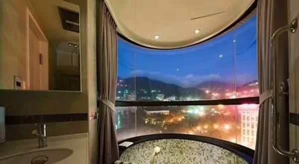 ◆主卫浴间刻意在窗边规划了下沉式的浴缸,半圆的设计加上户外景致,让空间弥漫浪漫因子。