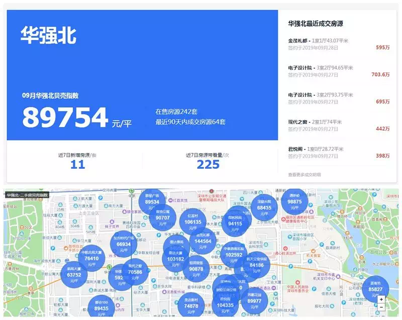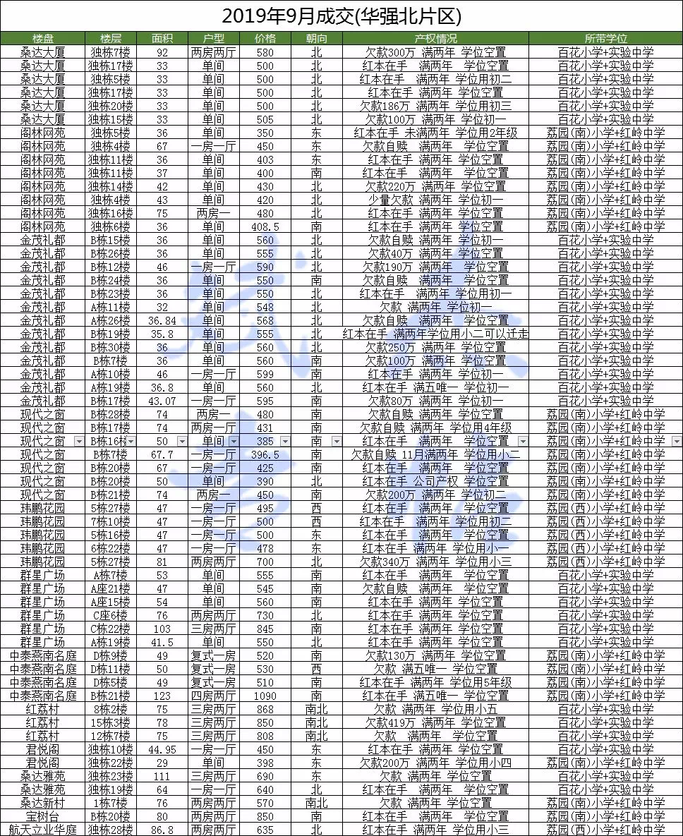 (数据来源于贝壳网)比如你看南天二花园的房,年初89平方3房成交就在1300万左右,目前成交依然是这个区间;包括国城花园44平,成交价近一年一直维持在1000万左右;南天一花园,87平方年初成交在900万,107平成交在1100万,最近才开始有些略涨,但涨幅不大;金茂礼都36平年初成交价在550万,现在成交560万变化不大,这就给很多客户造成了一种感觉,自己关注的楼盘,并没有什么变化。但同时,长怡花园年初较好的101平的户型,成交980万,现在成交1050万,涨了70万;长安花园,年初3房成交均价在860万左右,现在成交价到了910万,涨了50万;赛格公寓43平年初的时候成交价在380万,8月份成交价在430万;桑达大厦3月份成交价440万,现在成交到了505万;群星广场1-8月份成交共50套,各种户型涨了30-50万不等。所以一个有趣的现象是,每个人对同样的市场会有不同的感知,当他出来真正看房的时候,发现很多一些同片区其它小区的户型,涨幅超过判断和预期,并且自己关注的片区,成交价虽然变化不大,但业主报价普遍上调,今年7~9月持续一波高峰成交,华强北和百花片区,平均每个月成交量均在50套左右。所以现在各小区盘源库存量已经比较紧张,可选房源和户型跟5-6月份相比已经少了很多,可能作为片区业主,从最近电话量,看房量,邻居交流中等各种渠道得到的信息反馈会更明显,我个人的感觉是目前形势基本面确实比较乐观,我们得到的数据是不仅是我们片区,我们周边的园岭、八卦岭、石厦等片区近几个月二手房成交量都非常稳定,超出去年同期,说明深圳整体的二手房成交在回温,对于一些本片区最近一年价格波动不大的片区,建议是时候可以多关注。下面我们看下9月份的成交数据(数据仅供参考,有些价格或许有些许偏差)华强北9月份成交