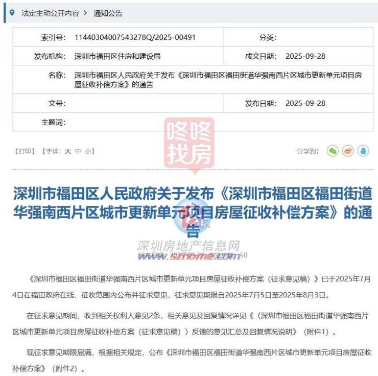 2024年8月,福田区福田街道华强南西片区城市更新单元房屋搬迁补偿权利主体公示。