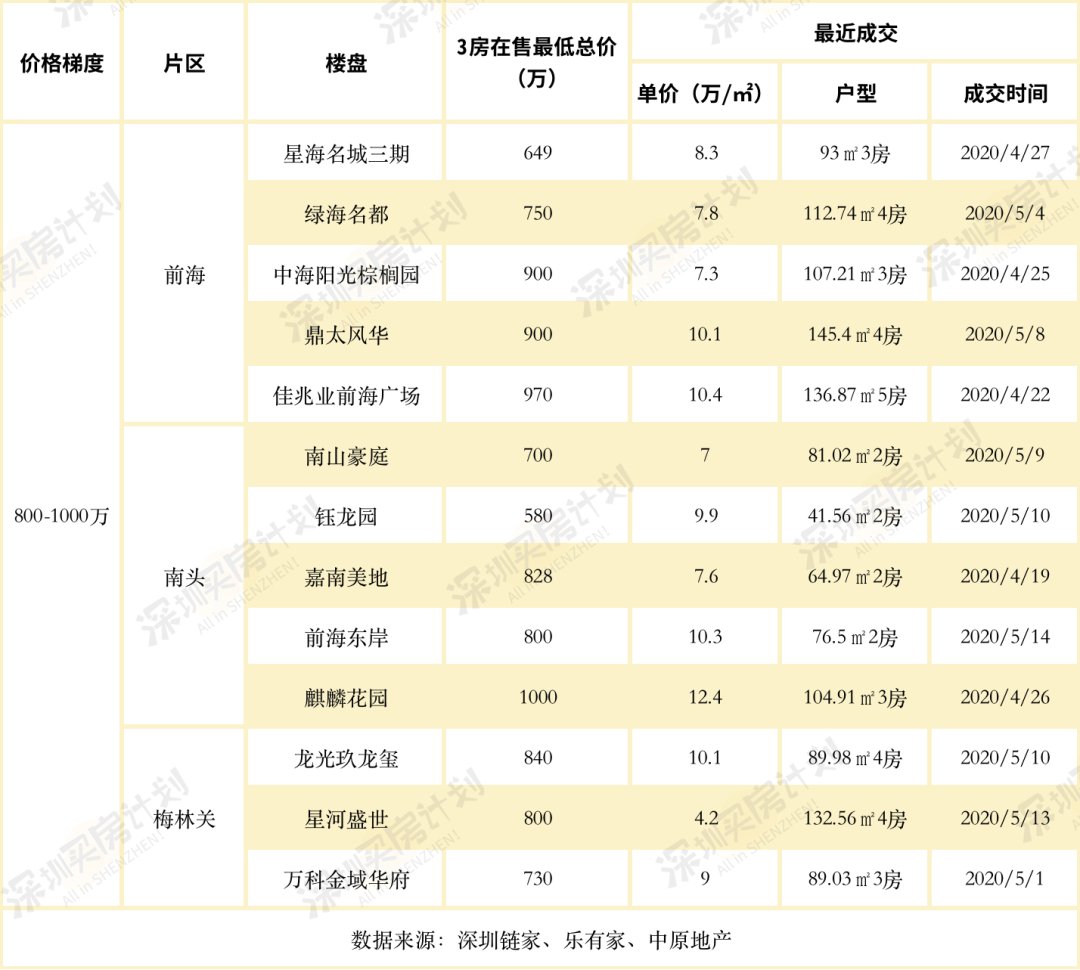 根据深圳贝壳研究院整理的全市约80个片区不同户型的套均总价数据,总价800-1000万买三房可选的片区并不少——