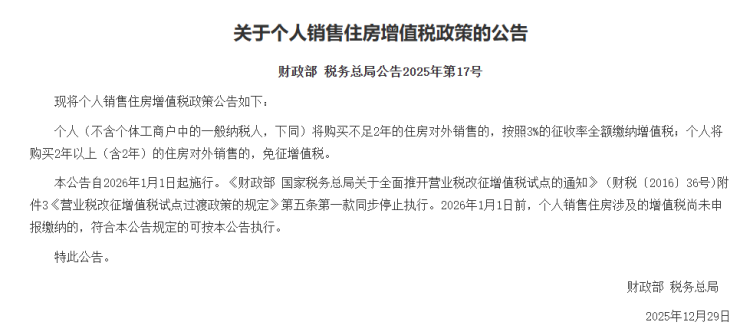 财政部、税务总局发布关于个人销售住房增值税政策的公告。