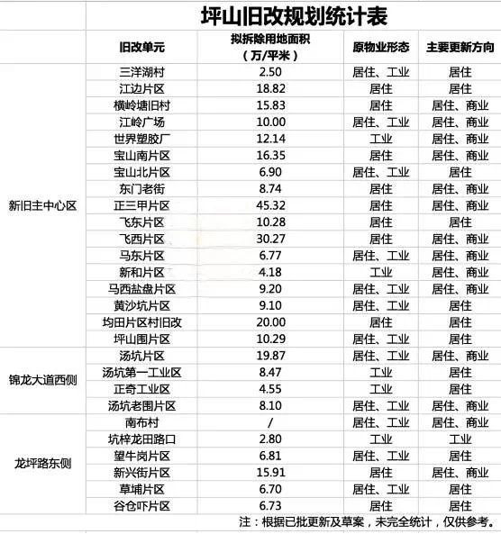 目前坪山已批复的旧改约30个,大大小小地遍布在全区各个区域。