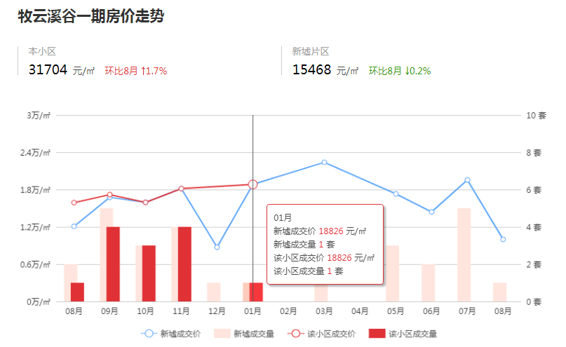 牧云溪谷新房与二手房的价格对比也很明显,项目一期二手房价格达到了3.2万/㎡以上,不仅比所在片区新墟的均价高出一倍,比项目五期的新房价格还贵。但有意思的是,牧云溪谷一期在今年1月份有过1套成交后,至今仍没有新的成交数据,当时那套房源的成交价约1.9万/㎡,与项目五期新房的备案价相差无几。