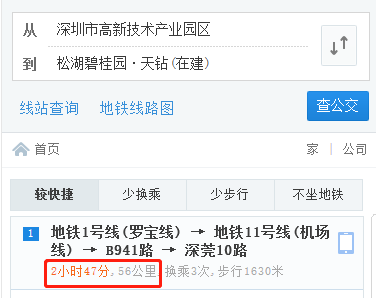 如果改换公共交通,则需要2小时27分,单程费用大约15元,如果每天往返于两地还是很不方便。再来说松湖碧桂园•天钻这个项目,位于松山湖总部基地旁,距离华为小镇仅1公里,未来即使不住这里出租出去,也不愁找不到租客。