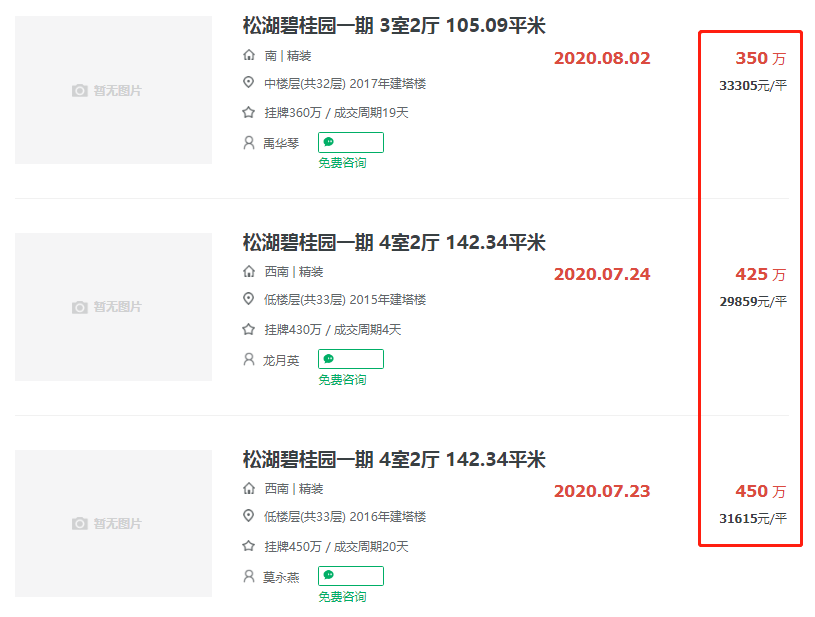 另外,W在链家上查了松湖碧桂园的二手房价格,最近的交易是在8月2日,105㎡精装三房成交价350万,单价约3.3万/㎡,跟新房价格差不了太多。W在想是不是因为周边配套不完善所以一二手房差价不是很大,而中介给他的答案是,“现在东莞环境好的小区也是值得这个价格”。