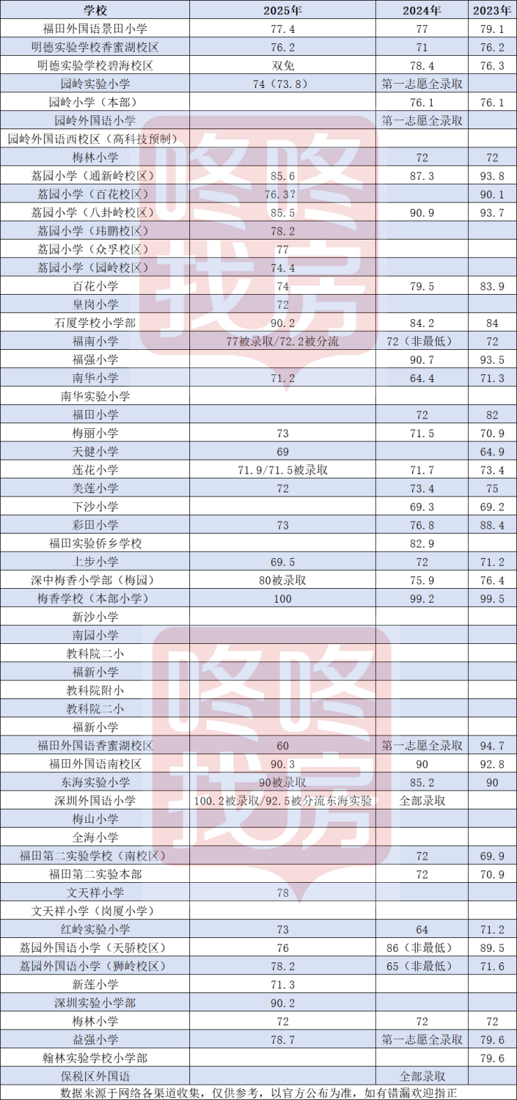 荔园小学,南北西三个校区,北校区百花校区,前两年的积分都要90来分,这次今年76.3分就可以上。南校区通新岭校区积分线,今年也略有下降。