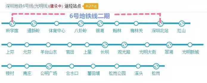 该线路设车站20座,其中地下站5座,高架站15座,与4、5、11、13号线及广深港客运专线综合换乘。| 6号线二期(深圳北站-科学馆站)二期工程线路全长约11.7km,包括7站7区间,换乘车站5座,线路从深圳北站预留高架桥工程引出。