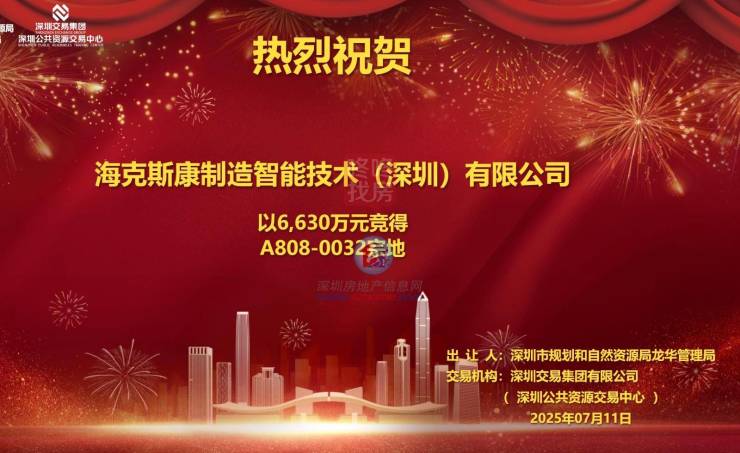 7月11日,龙华普通工业用地(宗地号A808-0032)成功出让,海克斯康制造智能技术(深圳)有限公司以底价6630.00 万元竟得,该公司为此前的遴选方案意向用地单位。