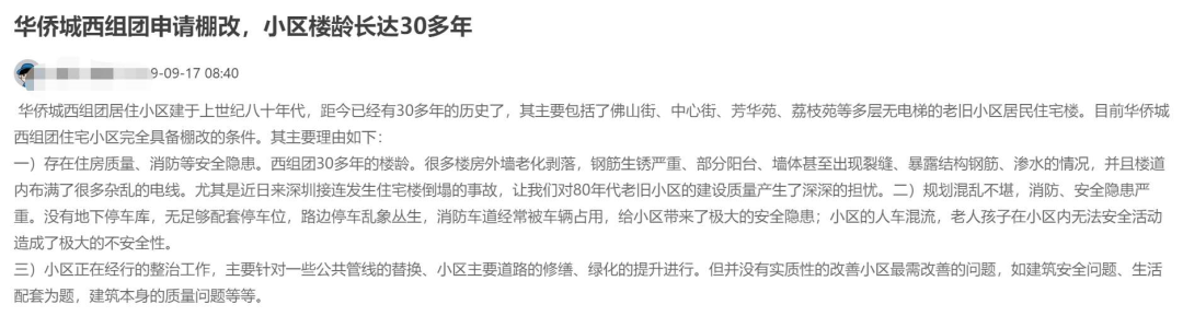 2019年,就有该组团小区业主认为华侨城西组团住宅小区完全具备棚改条件,主要理由如下: