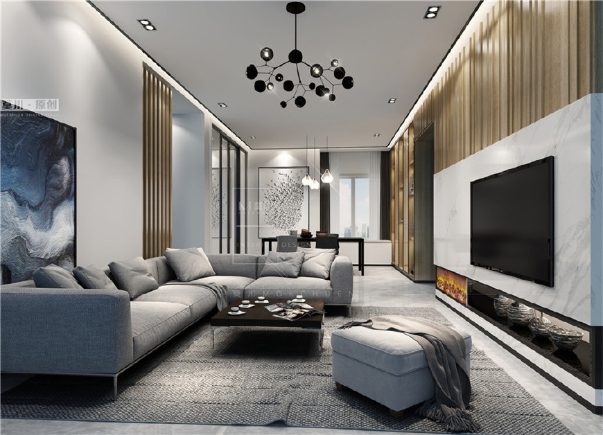 客餐厅墙面采用木饰面与格栅搭配大理石的处理手法尽显细节与大气,天花黑钢走边既精致又个性。