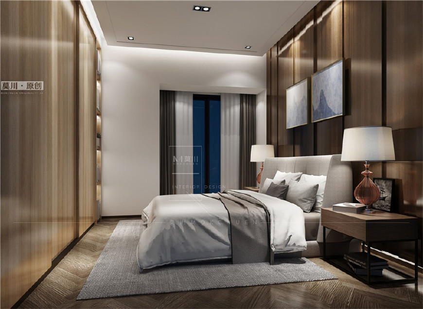 3.主卧空间在满足储物功能同时设计成了背景墙的一部分,简约大气。