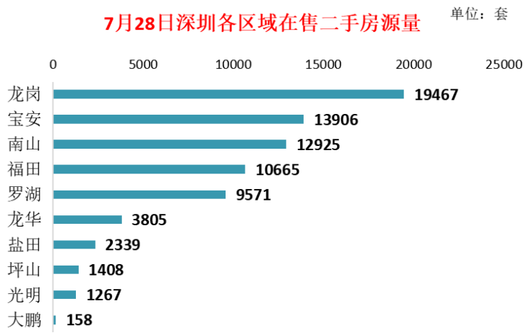 根据公开在售二手房源量数据统计,截至2025年7月28日,全市共有75,511套有效二手房源在售,较上周增加391套。从各区域在售量看,龙岗占总量25.8%,排第一。全市有4个区域二手房在售量超万套,不同区域分布量呈现明显差异。