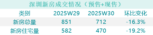 据深圳市房地产信息平台数据,2025年第30周全市新房(预售+现售)成交量下降。