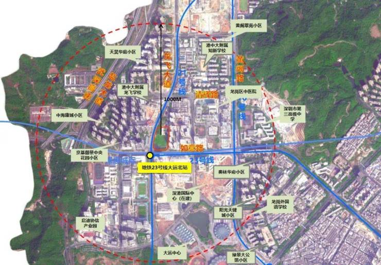 深业泰瑞府是深业&深铁龙岗大运G01048-0153地块,位于龙飞大道与如意路交界处,项目南邻大运中心,东邻佳兆业未来花园,西侧是大量成熟住宅区,例如睿智华庭、中海康城等。