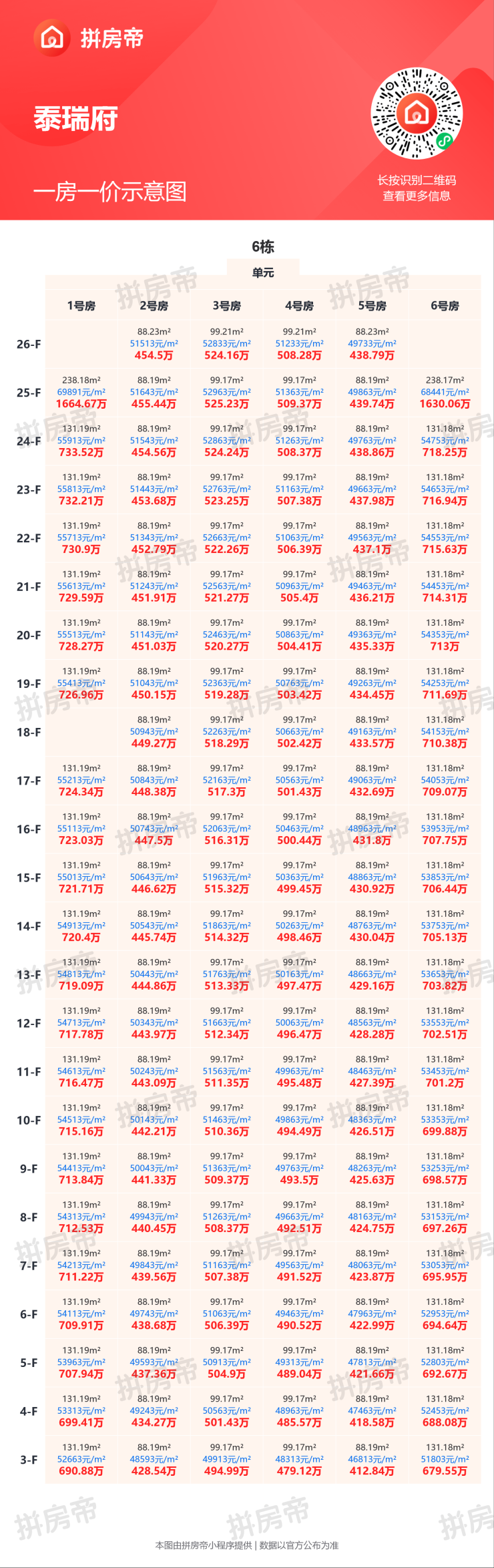 泰瑞府本次推出6栋的141套房源,主推建面约88-131㎡户型,另有2套建面约238㎡大户型。项目备案均价约5.18万/㎡,单价区间约4.68-7万/㎡,总价区间约413-734万,其中建面约238㎡户型总价区间约1630-1665万。