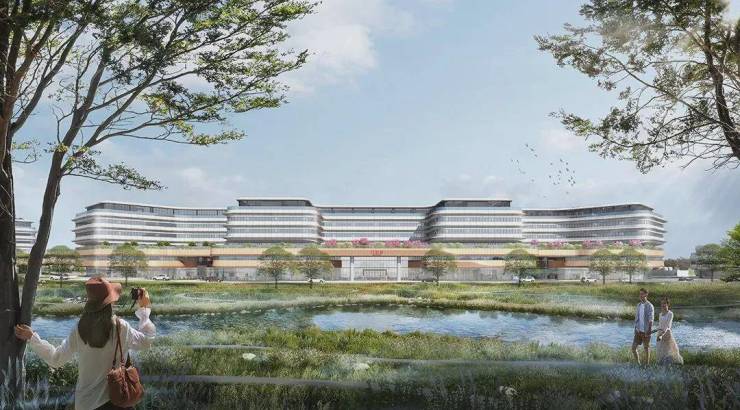 此外,项目将“生态医院”的主题贯穿全过程,充分融入地域和大学的文化特点,依托绝佳的地理位置,以山水为灵感,形成“山水动脉”的设计理念,旨在探索人、自然和空间之间的联系。这一设计理念呼应整体布局,与城市及景观紧密结合,让患者能够“疗愈于山水”。