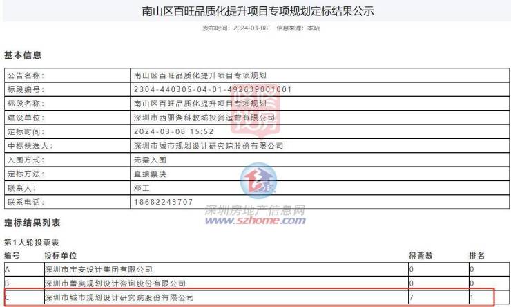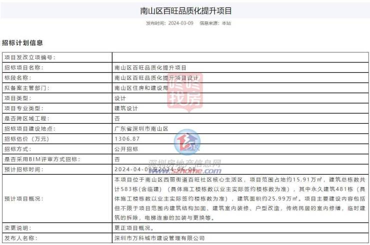 2024年3月9日,万科就曾中标南山区百旺品质化提升项目,标段分为项目施工总包,约4.357亿元;提升项目设计约1306万。