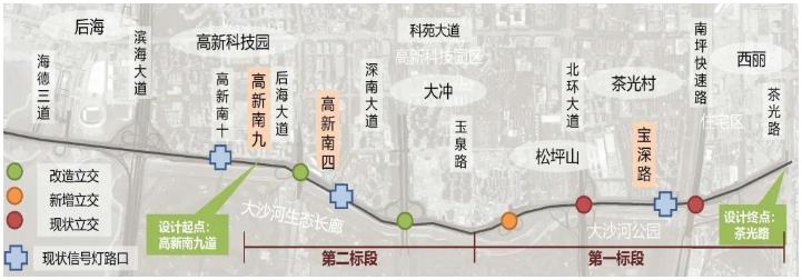 沙河西路快速化改造项目南起高新南九道,北至茶光路,全长约4.53公里,是在既有城市主干道的基础上,将道路提升为城市快速路。