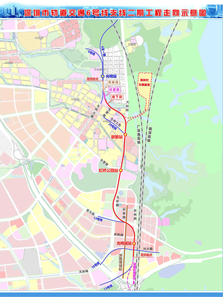 其中,6号线支线二期线路全长4.96公里,南起在建的13号线光明城站,终点北至既有6支一期光明站,共设光明城站、虹桥公园站、碧眼站三座地下车站,采用全自动无人驾驶模式。