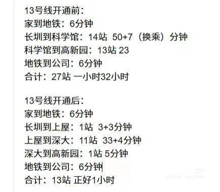 有网友晒出自己的通勤路线图,13号线通车前,地铁27站,通勤1个半钟;13号线通车后,地铁13站,通勤1小时。