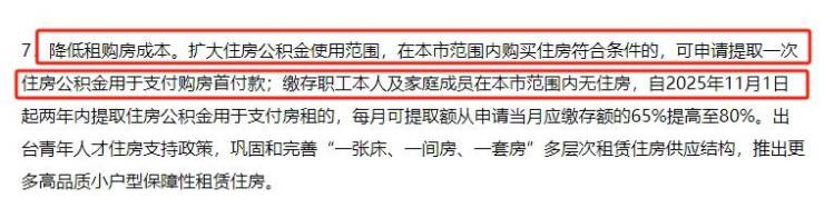 在租购房方面,《方案》还提出,自2025年11月1日起两年内,缴存职工本人及家庭成员在本市无住房,提取住房公积金用于支付房租的,每月可提取额将从申请当月应缴存额的65%提高至80%。