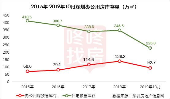 来自深圳预售库系统的数据显示:近年来深圳办公用房的库存量一路飙升,2015年底办公用房预售库存量68.6万平方米,到2018年底增加至138.2万平方米,截止2019年10月底,办公用房预售库存量92.7万平方米,按最近12个月的销售速度,去化周期为17.5个月,这仅是预售系统的存量和去化周期,深圳很大比例的办公楼,是直接进入现售系统的,所以深圳办公楼的库存压力是很大的。