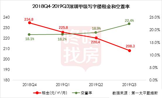 根据排名前列太平戴维斯公布的数据显示:自2018年四季度以来,深圳甲级写字楼租金连续三个季度下滑,从2018年第四季度的234.8元/㎡/月下跌至2019年第三季度的208.3元/㎡/月,空置率则由2018年第四季度的18.1%上升至2019年三季度的22.4%。