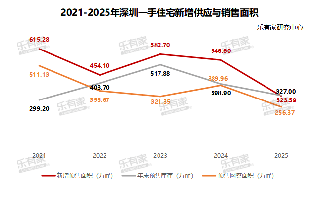 据乐有家研究中心统计,2025年深圳累计新增300+万㎡新房预售面积,同比减少了41%。