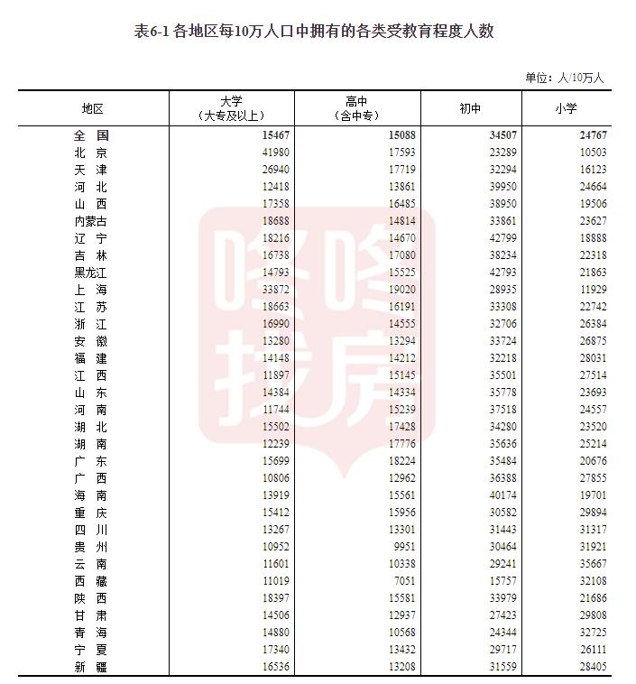 全国人口[2]中,拥有大学(指大专及以上)文化程度的人口为218360767人;拥有高中(含中专)文化程度的人口为213005258人;拥有初中文化程度的人口为487163489人;拥有小学文化程度的人口为349658828人(以上各种受教育程度的人包括各类学校的毕业生、肄业生和在校生)。与2010年第六次全国人口普查相比,每10万人中拥有大学文化程度的由8930人上升为15467人;拥有高中文化程度的由14032人上升为15088人;拥有初中文化程度的由38788人下降为34507人;拥有小学文化程度的由26779人下降为24767人。