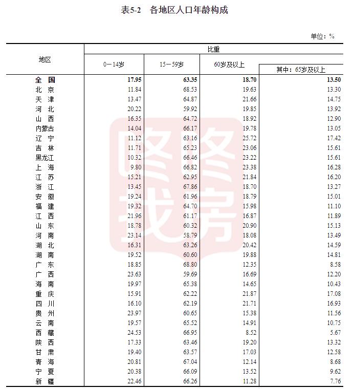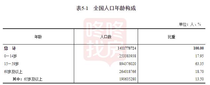 5、年龄构成。0—14岁人口为25338万人,占17.95%;15—59岁人口为89438万人,占63.35%;60岁及以上人口为26402万人,占18.70%(其中,65岁及以上人口为19064万人,占13.50%)。与2010年相比,0—14岁、15—59岁、60岁及以上人口的比重分别上升1.35个百分点、下降6.79个百分点、上升5.44个百分点。我国少儿人口比重回升,生育政策调整取得了积极成效。同时,人口老龄化程度进一步加深,未来一段时期将持续面临人口长期均衡发展的压力。