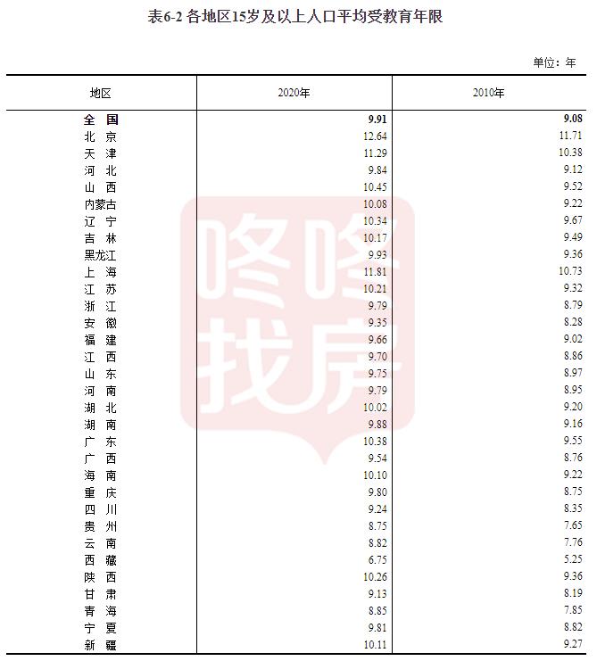 与2010年第六次全国人口普查相比,全国人口中,15岁及以上人口的平均受教育年限由9.08年提高至9.91年。