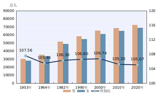 全国人口[2]中,男性人口为723339956人,占51.24%;女性人口为688438768人,占48.76%。总人口性别比(以女性为100,男性对女性的比例)为105.07,与2010年第六次全国人口普查基本持平。