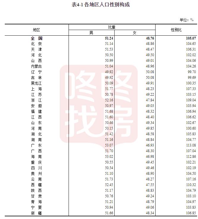 31个省份中,总人口性别比在100以下的省份有2个,在100至105之间的省份有17个,在105至110之间的省份有9个,在110以上的省份有3个。