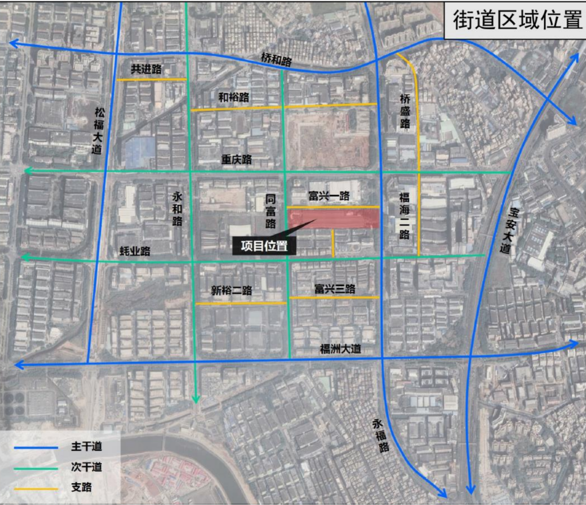 该项目位于宝安区福海街道重庆路与同富路交汇处东南侧。拆除范围面积为36300.8㎡,开发建设用地面积为30850.8㎡,规划容积为140769㎡,规划容积率4.6。