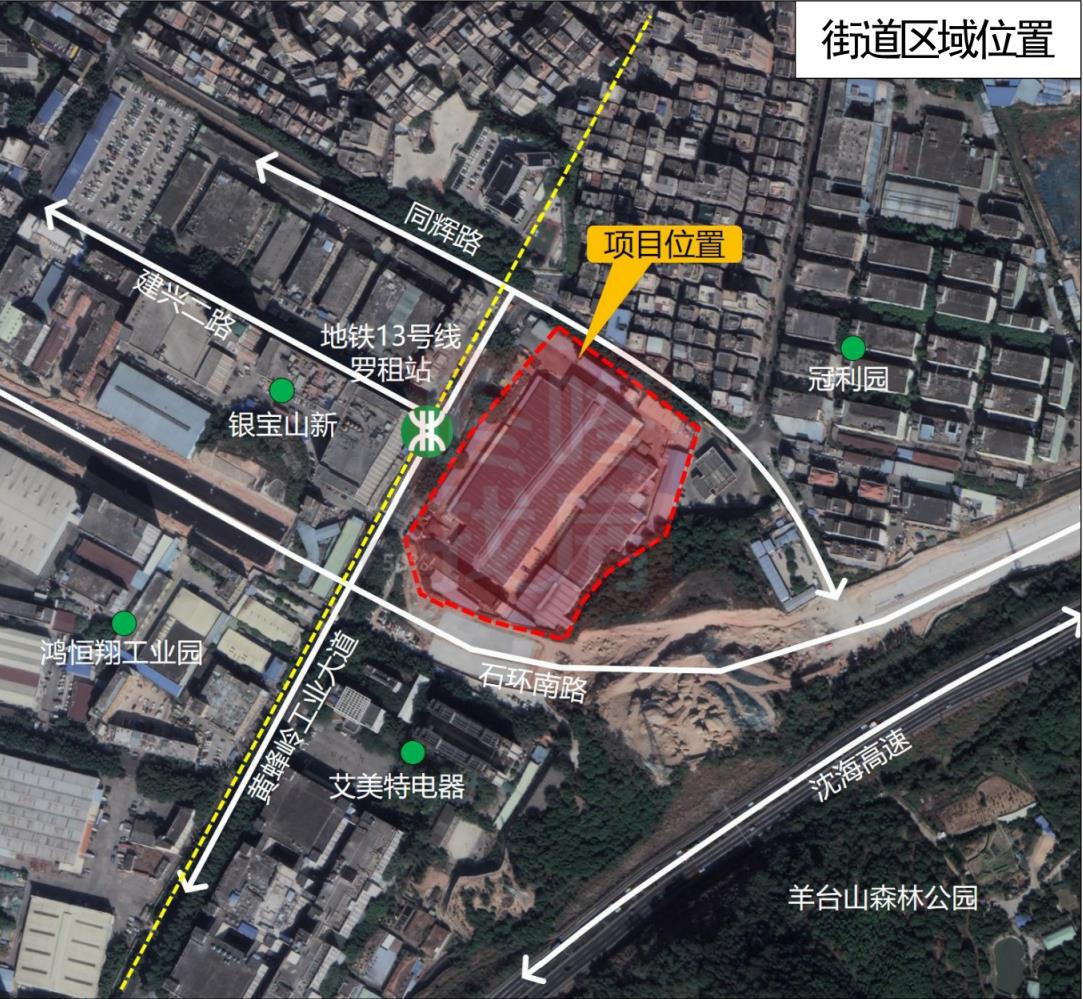 该项目位于深圳市宝安区石岩街道罗租社区,黄峰岭工业大道与石环南路交汇处东北侧。更新单元用地面积32376.2㎡,拆除范围用地面积32376.2㎡,开发建设用地面积22663.0㎡,规划容积176816㎡,规划容积率7.8。