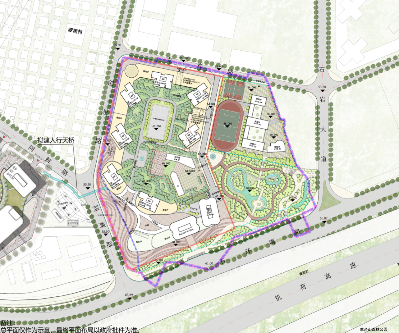 其中,住宅158735㎡(含保障性住房44320㎡),商业、办公及旅馆业建筑61169㎡(含酒店20000㎡),公共配套设施(含地下)14910㎡(含12班幼儿园建筑3960㎡、占地面积3600㎡,社区老年人日间照料中心800㎡、社区健康服务中心2800㎡、便民服务站800㎡、社区管理用房600㎡、文化活动室1500㎡、地下公共充电站1200㎡、社区体育活动场地1500㎡(不计容)、社区级公共配套用房3250㎡)。