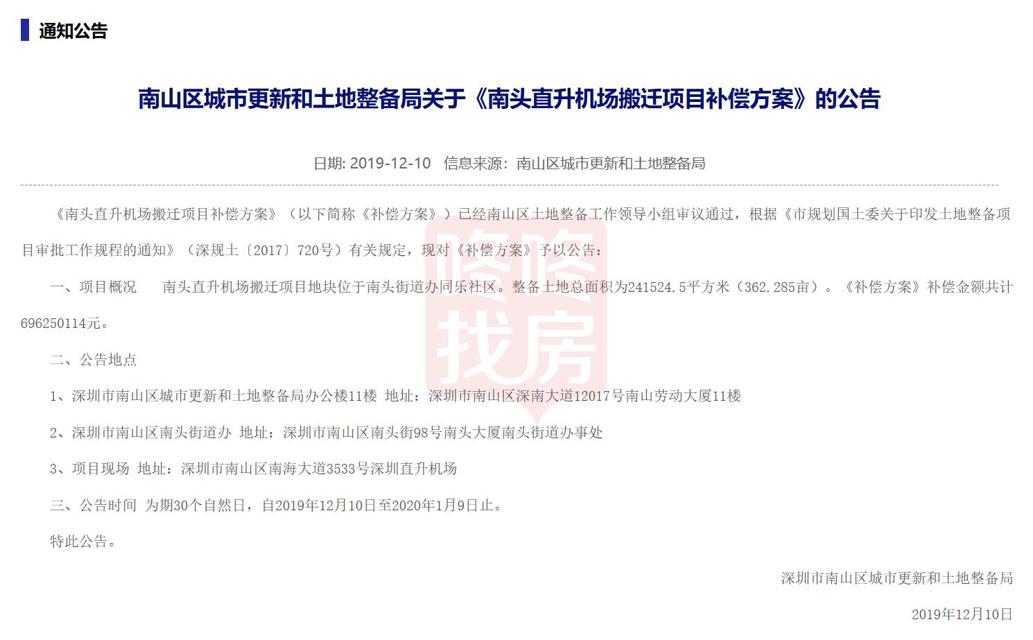 12月10日,南山区城市更新和土地整备局发布《南头直升机场搬迁项目补偿方案》。《补偿方案》补偿金额共计6.96亿元。