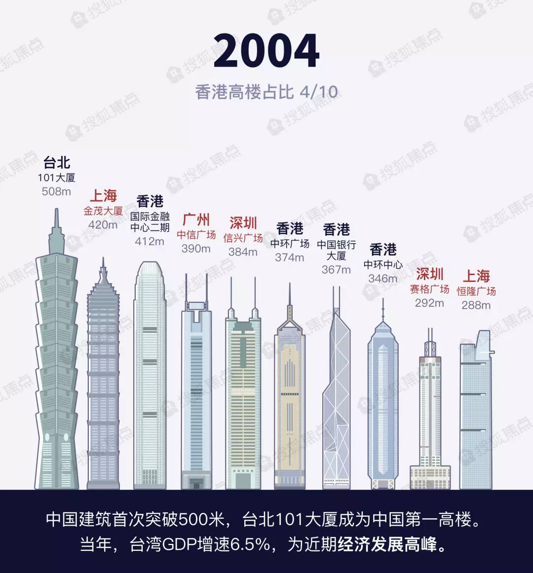 2004年,台北101大厦成为当时的世界排名前列高楼,也让中国的天际线突破了500米。当年,台湾GDP增速6.5%,为近期经济发展高峰。