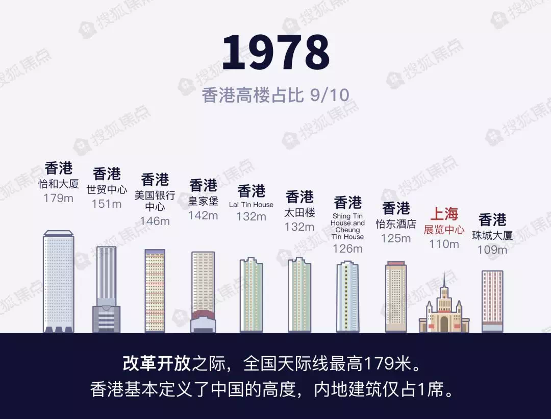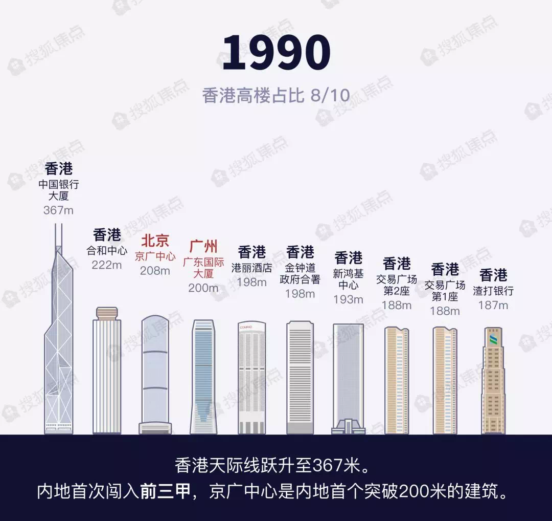 彼时香港已经有了成群的摩天大楼,香港的高度就是中国的高度。从1978年到1989年,香港几乎把控着中国天际线的前十位,是内地学习的目标和典范。