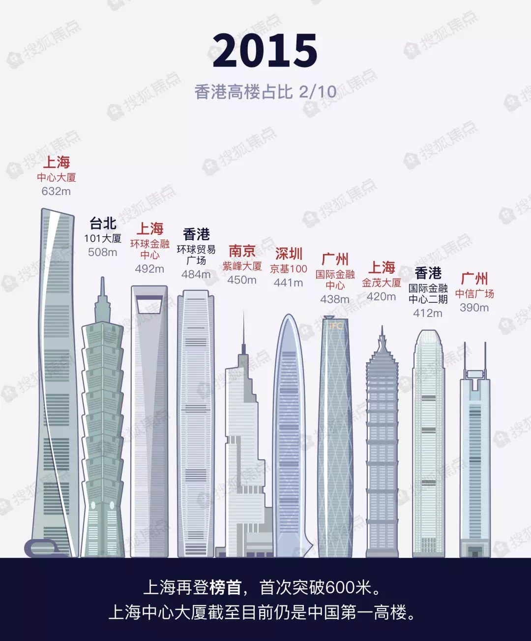 在前十高楼的榜单上,内地建筑首次占据前两位。