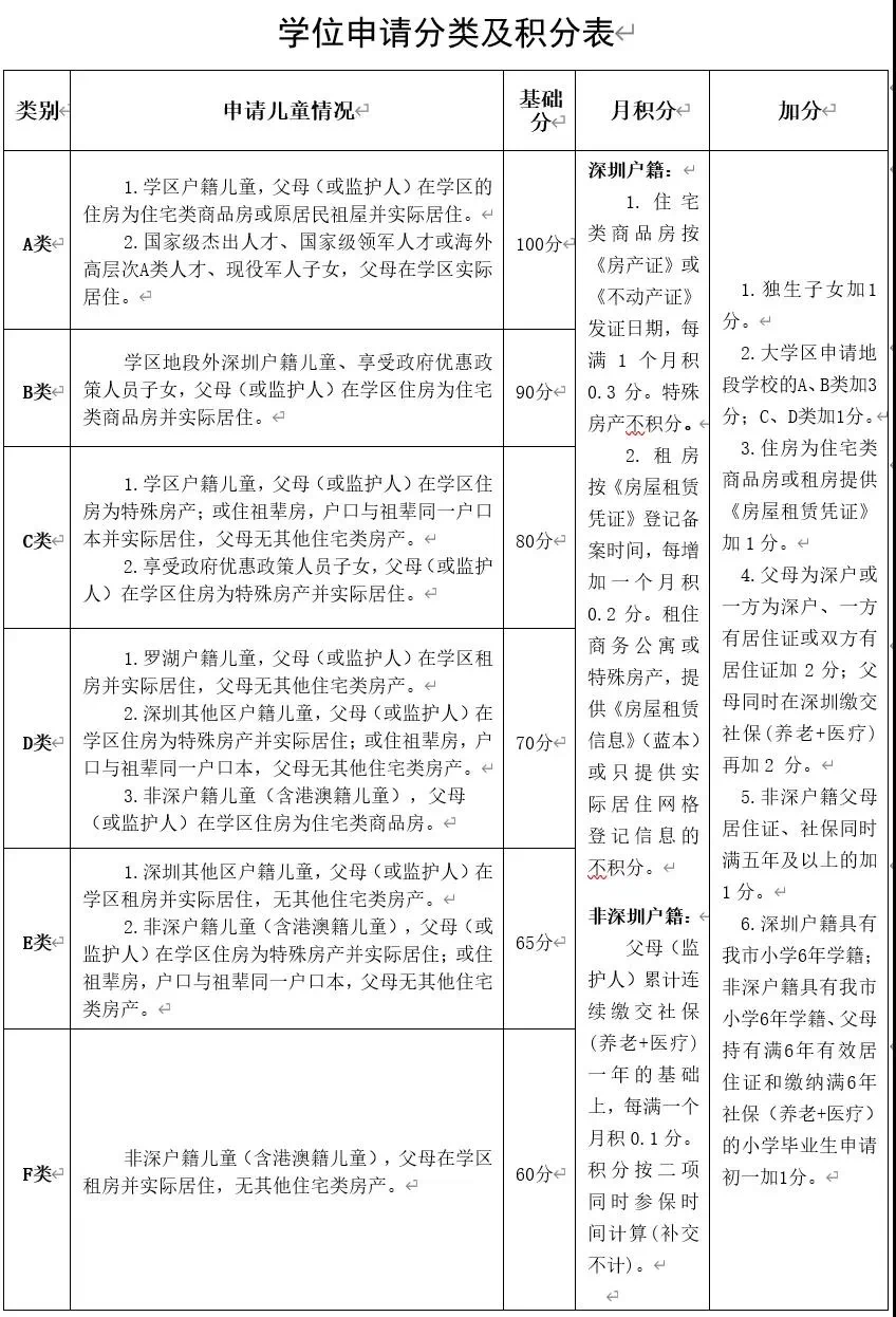 根据市教育局2020年招生工作会议精神及《2020年深圳市义务教育招生积分入学工作思路》要求,经公开征求意见罗湖区教育局对《罗湖区义务教育学位申请分类和积分办法》依法作出修订。1分类和积分对象在罗湖区实际居住,符合罗湖区义务教育学位申请条件的:1. 深圳市户籍儿童、少年;2. 符合《深圳市非深户籍人员子女接受义务教育管理办法》(深府规〔2018〕3号)文件规定的非深户籍申请儿童、少年;3. 现役军人、烈士、高层次人才等享受政府相关优惠政策人员子女。2分类和积分办法先按照申请儿童及父母的户籍和居住情况划分学位申请类别,再按申请儿童父母(或监护人)的居住、社会保险时间(养老保险+医疗保险)和计生等情况计算月积分和加分。录取时,视学位数量划定类别/积分线,按申请儿童的类别/积分高低和志愿顺序由申请系统电脑排位录取。同类别按积分从高到低录取。(详见《学位申请分类及积分表》)(一)类别根据申请儿童及父母的户籍和居住情况划分申请类别,共分A、B、C、D、E、F六类。(二)积分积分由“基础分+月积分+加分”构成。1.基础分:按不同的类别给予基础分,A类100分、B类90分、C类80分、D类70分、E类65分、F类60分。2.月积分:根据申请儿童及父母的户籍、居住、社保等不同情况按月积分。(1)深圳户籍儿童①学区住房为住宅类商品房的按《房产证》发证日期,每满1个月积0.3分。特殊房产不积分。②学区租房按《房屋租赁凭证》签署(备案)日期,每满1个月积0.2分。租住商务公寓或特殊房产,提供《房屋租赁信息》(蓝本)或只提供实际居住网格登记信息的不积分。(2)非深圳户籍儿童申请儿童父母(监护人)累计连续缴交社保(养老+医疗)一年的基础上,每增加1个月积0.1分。积分按二项同时参保时间计算(补交不计)。如果参保时间不一致,则按参保时间较短险种计算(以社保局比对验核结果为准)。3.加分:按相关政策要求,对不同情况给予一定加分。①独生子女加1分。②实行大学区招生的地段,申请原地段学校的A、B类加3分;C、D类加1分。③住房为住宅类商品房或租房提供《房屋租赁凭证》加1分。④父母为深户或一方为深户、一方有居住证或双方有居住证加2分;父母同时在深圳缴交社保(养老+医疗)再加2 分。⑤非深户籍父母居住证、社保同时满五年及以上的加1分。⑥深圳户籍具有我市小学6年学籍,非深户籍具有我市小学6年学籍、父母持有满6年有效居住证和缴纳满6年社保(养老+医疗)的小学毕业生申请初一加1分。(注:④⑤⑥项单亲家庭视实际情况加分。离异家庭能同时提供孩子父母双方居住证和社保证明且符合条件的,享受同样加分。)
