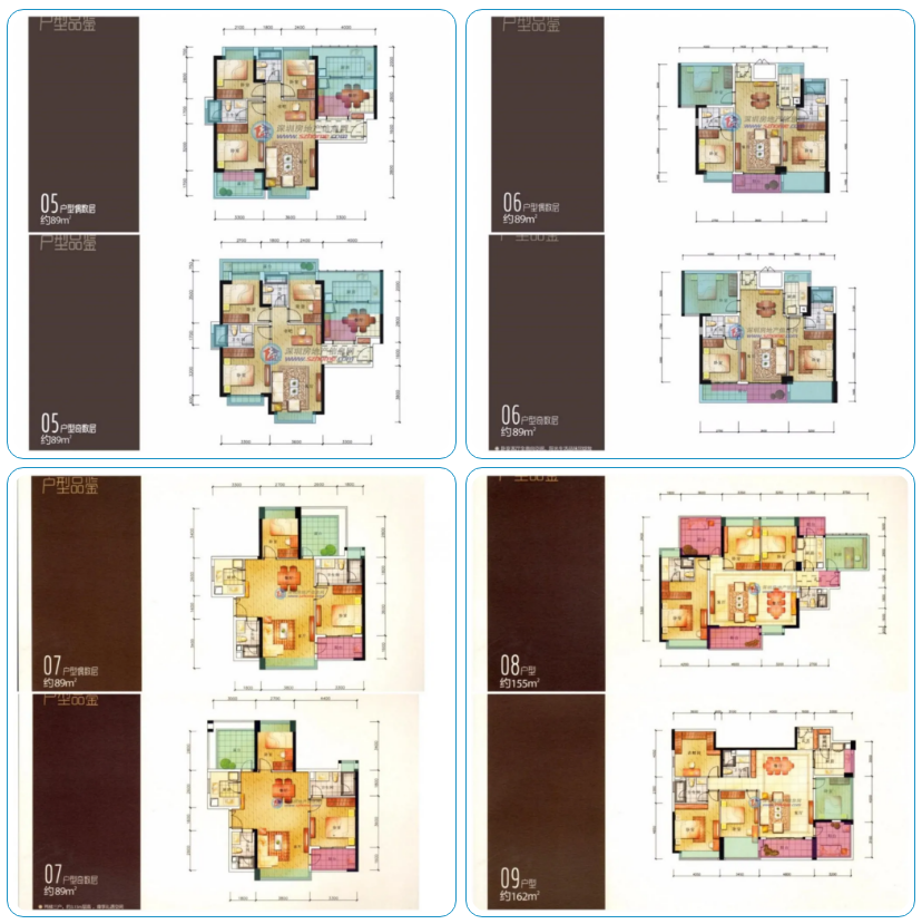 大户型:分布在3-4栋,155-162平两梯三户,五房格局,每个房子都大于10个平方,155平是横厅设计,四个房子对着花园,162平竖厅设计,主次两边开,私密性好。不足的是大户型靠近高铁,会受噪音影响。