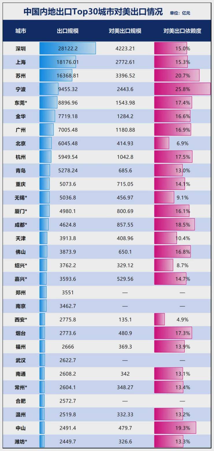苏州对美出口超过3000亿,上海、宁波超过2000亿。