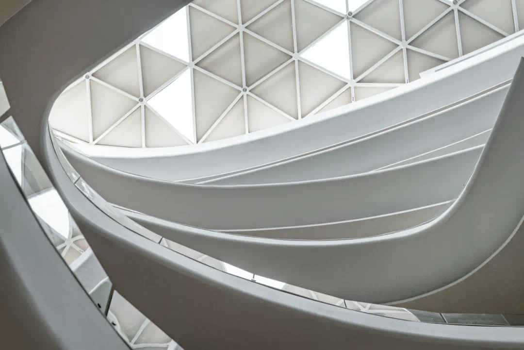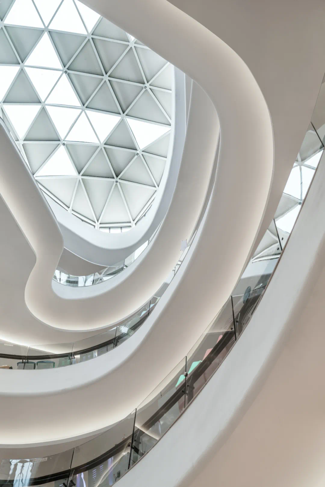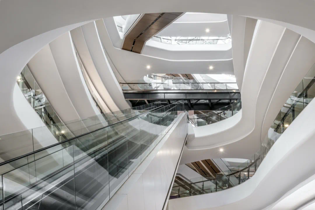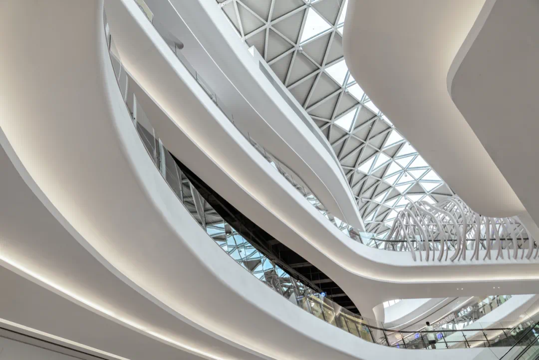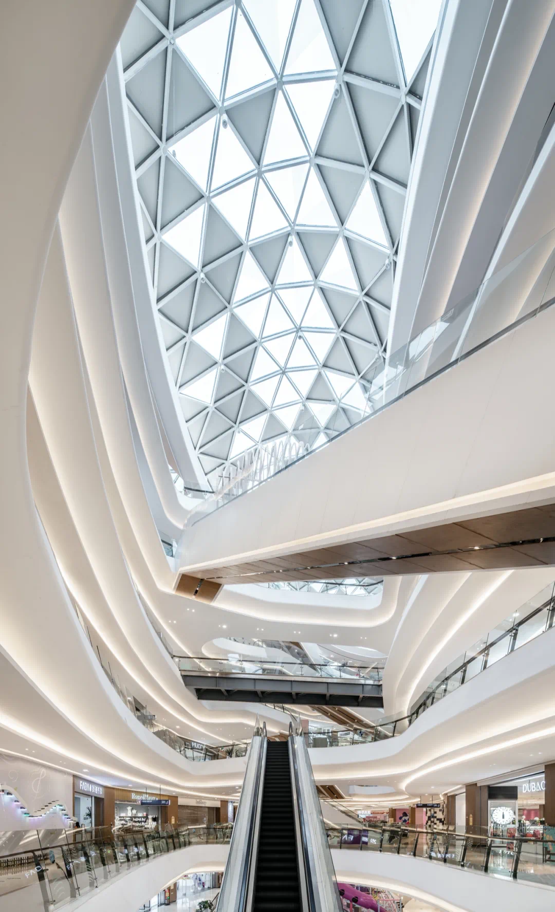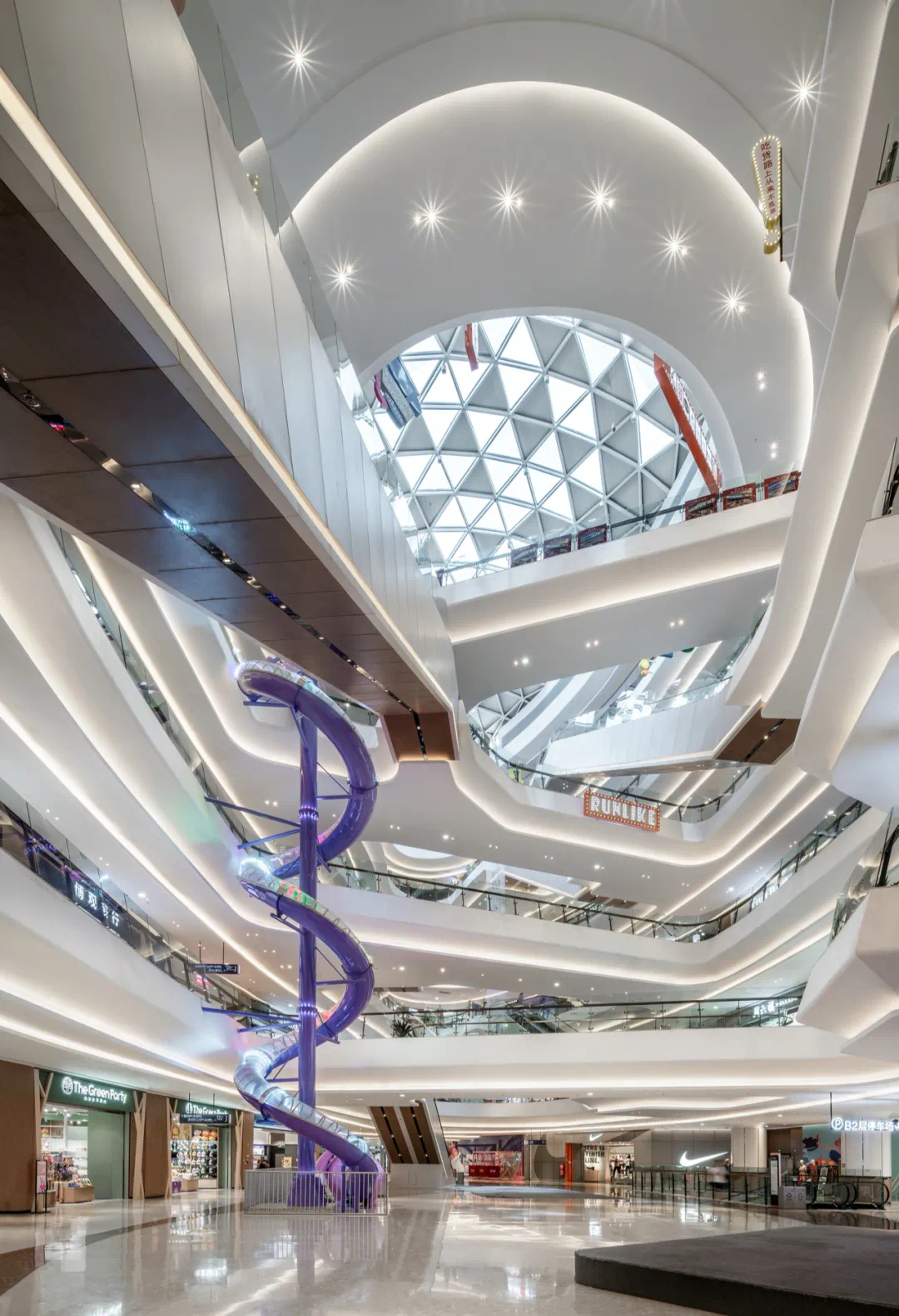 室内一体化设计委托LB凌奔设计担纲进行。“作为一个城市的新商业中心,它必须有普世的吸引力。”凌奔先生说,“同时,购物中心也要有它对于一个城市的担当,将本地的高端消费留在本地,将城市的消费审美提升至一线城市的水平。”LB凌奔设计给出的方案是,以“城市嘉年华”为主题概念展开,成为超越萍乡想象、欢乐购物休闲的策源地。“空间有一种沉浸感,它让人跳脱当下的牵绊,体验当下的快乐,重新激活城市的生命力”。不仅限于空间美学、场景打造,LB凌奔设计更从社交心理、人性关怀、流量转化,打造兼具“烟火气”与“高级脸”、“商业逻辑”与“沉浸体验”的欢乐空间。01.曲线能量,打破常规Curve energy,,think outside the box整体空间致敬扎哈·哈迪德,以艺术姿态的方式,呈现随性、优美而又舒缓的曲线,营造出轻盈纯净的整体环境,切割出空间的中庭,并一举打破传统购物中心的既定框架,在充分满足空间的弹性变化、动线规划、使用功能之上,构筑出室内的动线关系与空间的主体形态。