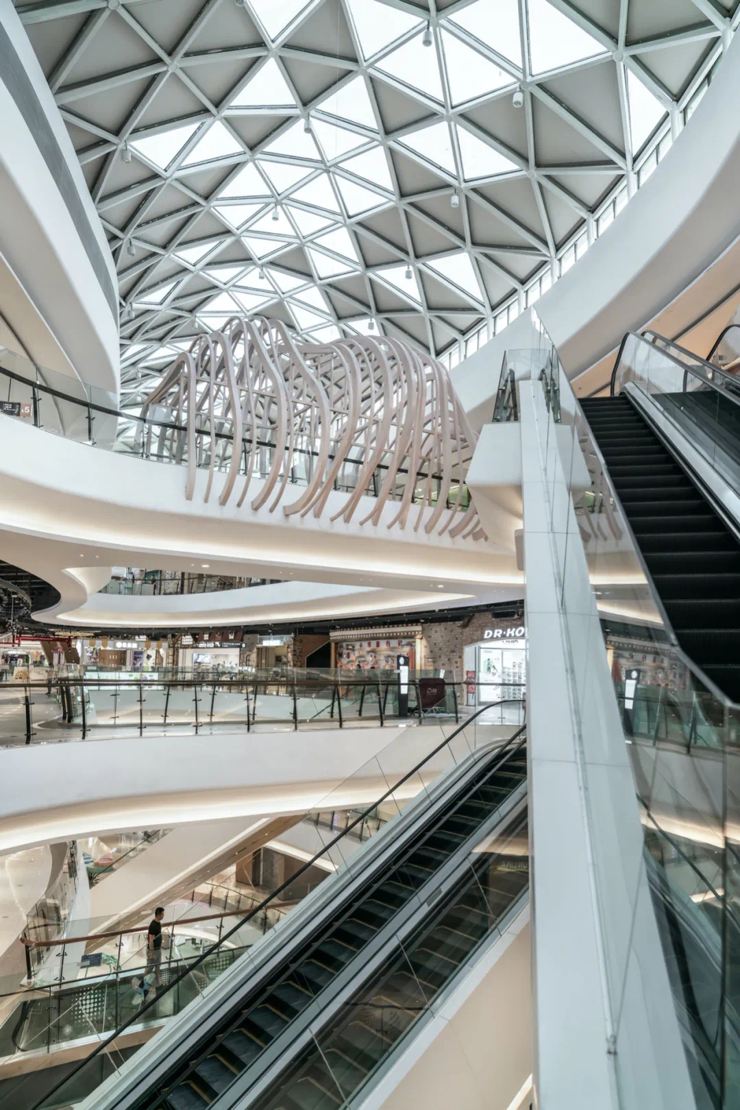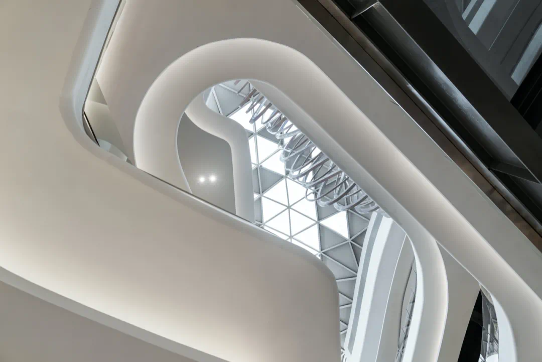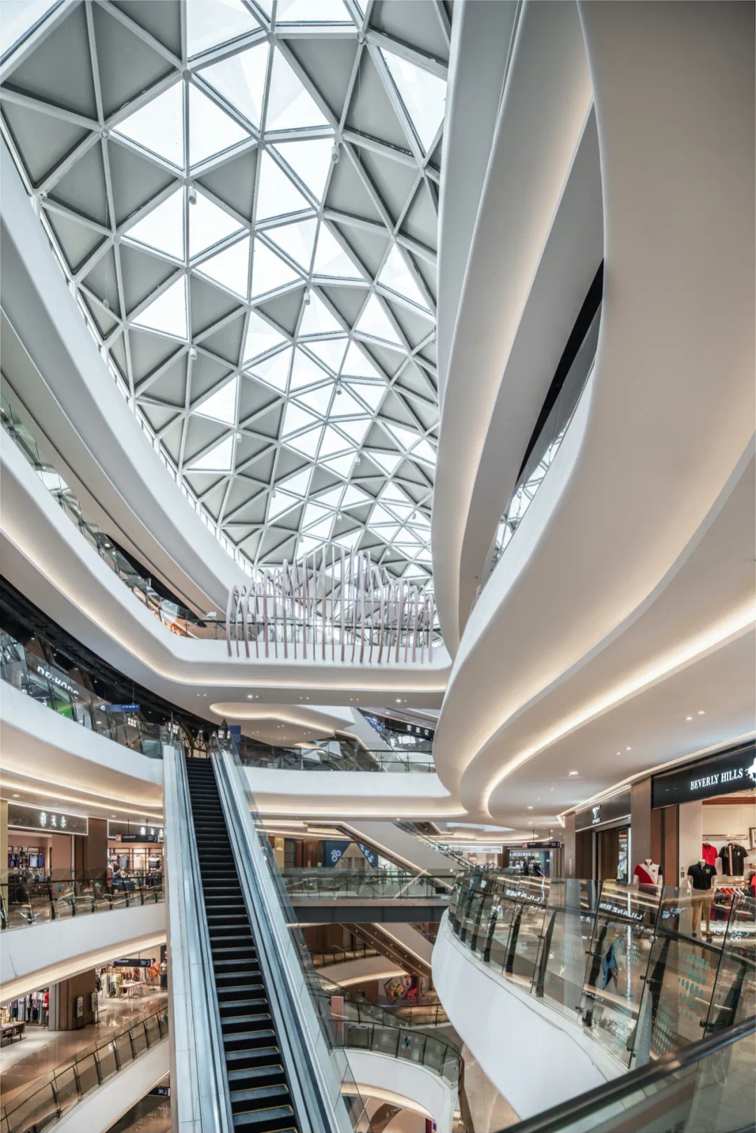 LB:我们想打造一个可以让人沉浸下来的环境,以白色为空间的主基调,扶梯和中庭融合,又沿着曲线的流线型伸展开去,整体空间轻盈、舒缓而简洁,让人可以轻松地走进去。走进去之后,就会发现空间的趣味。曲线的穿插和变化,形成层层叠叠的空间层次关系,特别是从楼下往上看的时候,曲线和面有不同的穿插关系,中庭的侧裙做了几个层叠,每一层的空间都富有变化,形成很强的视觉冲击力。同时,我们也给到店铺更多发挥个性的空间,不同的商家可以充分展示他们的特色和装饰手法,提供给逛街的人们更多的有质感的细节,带给他们更丰富的体验。