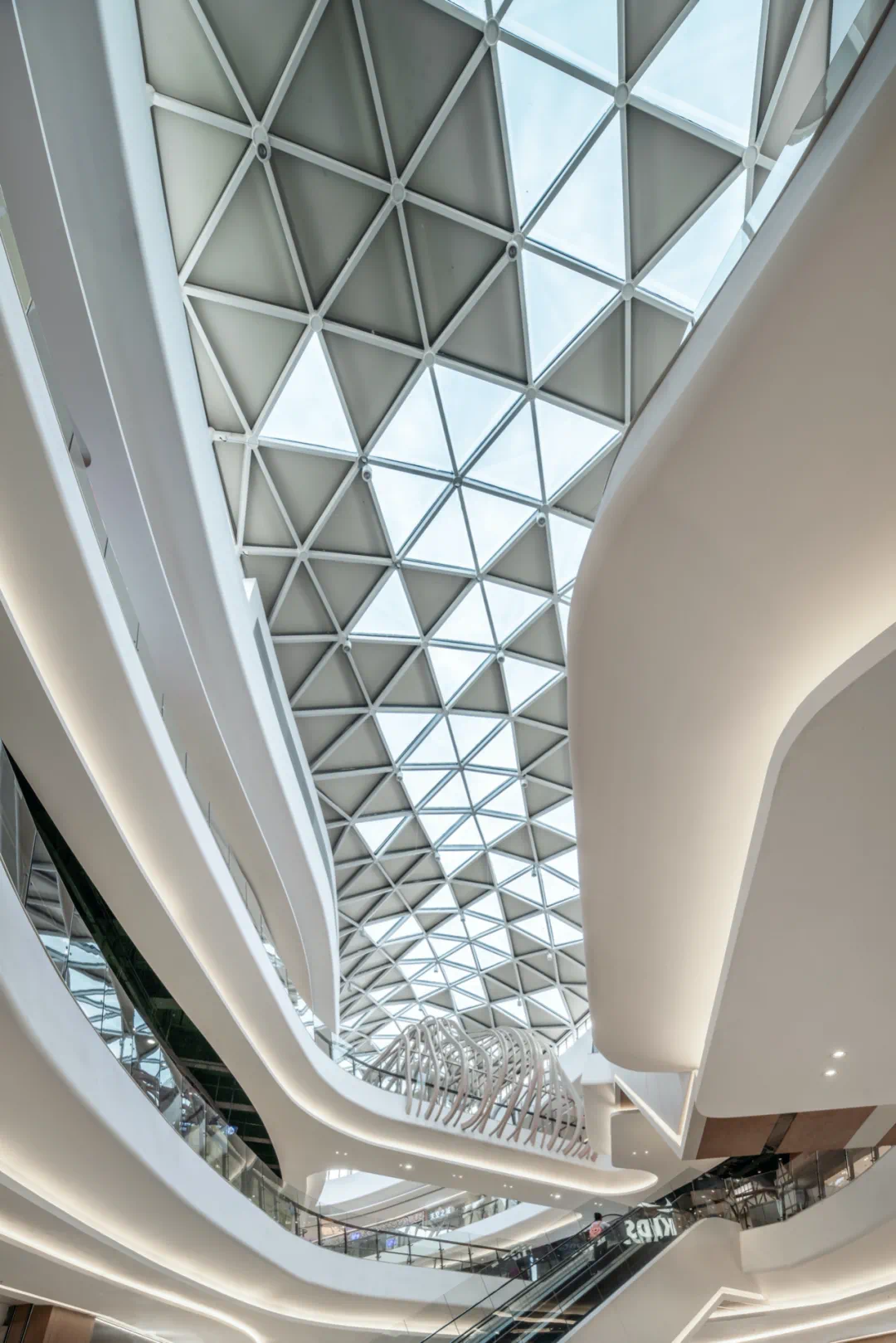 双中庭的存在,给购物中心注入灵动的活力,阳光穿过顶部的钢结构玻璃,宛如在空间建筑结构中流动的波浪,呈现出开敞的流动性和温润的通透感。水平走道与扶梯融合形成纯净的连续元素,表达出干净舒服的清新感。