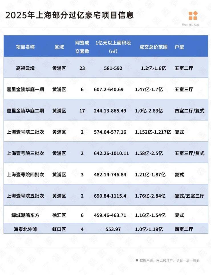 我们统计了2025年上海过亿豪宅网签成交情况,上半年上海壹号院、嘉里金陵华庭和绿城潮鸣东方三个项目就推出了16套过亿豪宅,其中绿城潮鸣东方6套总价超1亿元的顶复,最贵的一套接近1.54亿,开盘当天便一售而空。