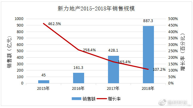 从2011年销售额不到3亿元,到2015年的销售额35.1亿元,之后三年销售额更以每年3倍速度增长;2016至2018年间,新力控股销售额分别达到161.3亿元、428.1亿元和887.3元亿元,复合年增长率高达136%。